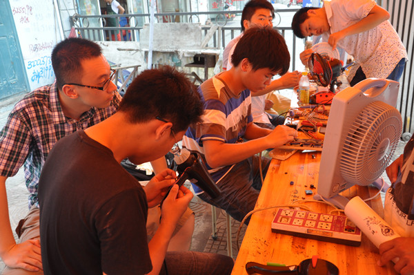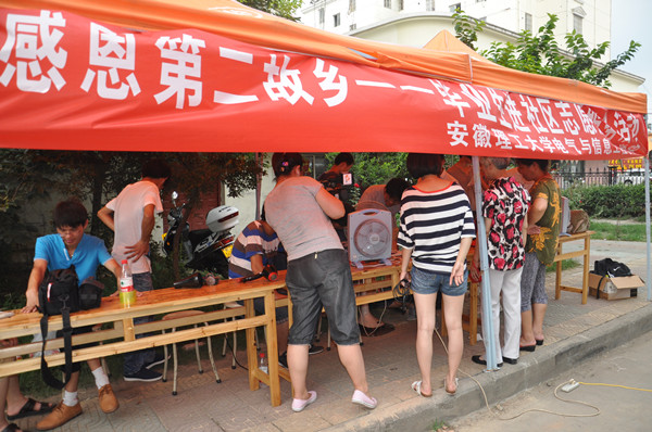 活动得到了社区的大力支持,小区负责人尹大叔积极为志愿者们寻找地点,提供电源。很快有居民拿来了电风扇、电吹风等电器,同学们马上投入到紧张的工作中,先大致判断电器故障的类型,再一件件打开,调试,维修,装配,试运行。时值高温,酷暑难耐。同学们一个个汗流浃背,衣服都湿透了,但同学们没有叫苦,没有停歇,始终以热情的态度,为居民提供周到的服务。对毕业生们的辛勤劳动和精湛技术,社区居民报以赞许的目光和热情的鼓励。
