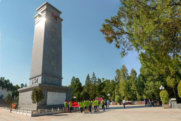实践团队来到金寨革命烈士陵园。陵园依山而建,拾阶而上,每一阶都寓意着金寨革命先烈作出的不朽贡献,也印证了那句诗:“毕生献伟业,青山埋忠骨,英魂归故里,功名垂千古”。据了解,在革命战争年代,金寨县10万青年报名参军,直到1949年全国解放,仅有674人幸存下来。在阶梯的尽头,二十四米高的“金寨县革命烈士纪念塔”映入眼帘,刘伯承元帅亲笔题写的“燎原星火”四个镀金大字刻在塔的正面,诉说着大别山革命老区为中国革命事业作出的不可磨灭的贡献。全体团队成员在塔前三鞠躬,表达对革命先烈最深切的缅怀。队员们在队长的带领下,面向团旗郑重宣誓,立志听党话,跟党走,肩负起民族复兴的时代重任。