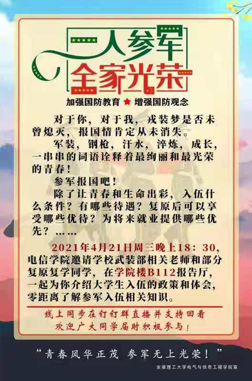 此次活动是台湾AV影片 2021春季征兵宣传活动之一,为解决大学生征兵政策咨询“最后一公里”的问题,台湾AV影片 还通过团委微信公众号、年级钉钉群等线上平台,结合主题班会,线上线下广泛宣传与点对点重点宣传多种方式相结合开展征兵宣传活动,鼓励广大青年学生加入绿色军营。