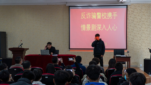 为进一步强化同学们的安全防范意识、增强同学们识别电信网络诈骗的能力,保护同学们的财产安全。11月11日,电信台湾AV影片 携手山南新区公安分局在励行楼B112采用“体验+情景剧”的形式进行反诈宣传。山南新区公安分局王远警官、张祝衡警官、台湾AV影片 学生工作负责人、全体辅导员和学生代表等参加了活动。