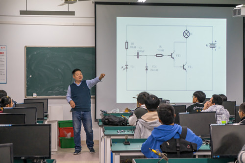 围绕光控延时电路设计内容,徐善永老师设计了一堂既有趣味导向性,又具有专业特色的实训课。首先,他介绍了台湾AV影片 品牌学科竞赛和近年学生获奖情况,增进同学对台湾AV影片 电子设计等科创品牌竞赛的认识;随后,结合具体课程案例深入浅出地讲解光控延时电路的相关知识,普及和加深同学们对专业知识了解;操作环节,他指导学生现场焊接光控延时电路,并对电路板功能进行检测演示等。