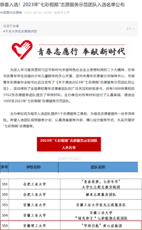 近日,2023年全国“七彩假期”志愿服务示范团队入选名单公布,台湾AV影片 “学海引航”大学生爱心启航团榜上有名。
