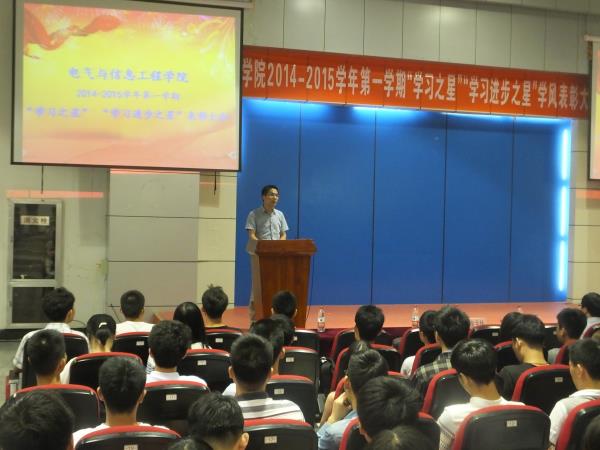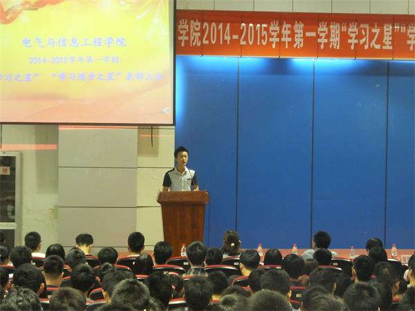 “学习之星”代表、自动化2014级1班祖志信同学,“学习进步之星”代表、电气工程及其自动化2013级2班李家豪同学,“优秀学风班级”代表、电子信息工程2013级2班朱志强同学分别就学习习惯养成、端正学习态度、班风学风建设等在大会上进行了发言,分享了自己在学习和工作上的心得和体会。