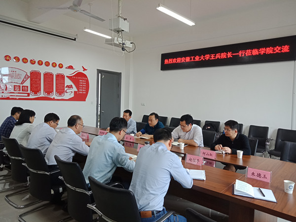 5月13日中午,安徽工业大学台湾AV影片 院长王兵一行4人来台湾AV影片 交流学科与专业建设工作,台湾AV影片 执行院长周孟然在励行楼B415会议室接待了王兵一行,台湾AV影片 业务副院长欧阳名三、曹珍贯及相关专业系主任参加了交流会。