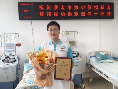 献血救人是程翔贯穿大学四年。2021年12月4日,在参与校红十字会造血干细胞捐献宣传活动时,他带头献血并留取捐献血样,大学期间累计献血五次。2023年7月,首次获悉与患者初配成功,他当即同意捐献,后因患者病情变化终止,深感遗憾。2025年5月22日,正值毕业繁忙时,他再次接到配型成功通知,当天正是程翔的生日,他视其为特殊生日礼物,积极配合完成高分辨匹配与体检,以患者为重静候捐献安排。6月13日,他刚回到河南老家便接到淮南市红十字会的捐献通知,立即在父亲陪伴下返程配合捐献。朴实的父亲说:“儿子是去救人,是行善,我得陪着他,为他做点事,给他加加油。”