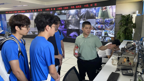 数字神经织就智慧网络,精密控制重构生产肌理。实践团一行首先来到朱集东煤矿调度中心,巨幅电子屏如湛蓝天幕,井下三维数据化作流动星轨。工作人员通过智能管控系统远程操控生产全流程,“一键启停、全域集控”的自动化场景让师生直观感受工业4.0时代的矿山变革。随后实践队员在工程师的带领下来到110kV变电站内,工程师详解智能电力监测系统如何实现故障毫秒级自诊断;地面制冷机房的恒温调控系统,以精密自动化手段重构千米井下作业环境;主井车房的智能提升装备则以毫米级控制精度,演绎着现代矿业“高效与安全并行”的技术哲学。