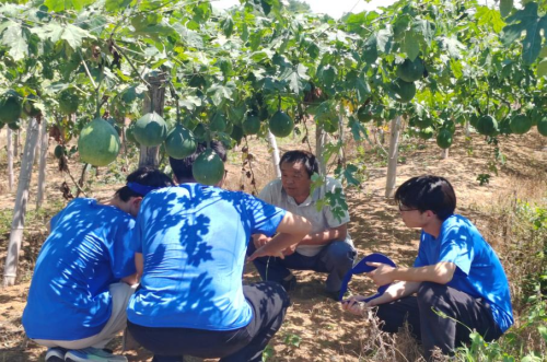 实践队重点调研了紫蓬镇特色鲜明的现代农业产业园。深入了解科技赋能让“紫蓬葡萄”成为畅销市场的“金果子”。在瓜篓籽种植加工基地,“现在的种植有了机械与科技的帮助,特色农业逐渐发展咯!”负责人欣慰地介绍。当队员们触摸着阳光玫瑰饱满的果粒,凝视瓜蒌架上沉甸甸的金黄果实,“丰收”已不仅是产量的数字,更是技术迭代的结晶、三产融合的硕果。