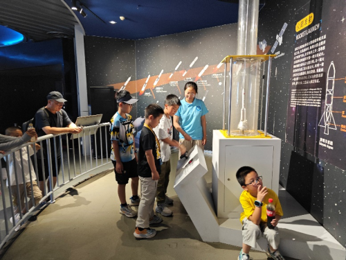 团队成员在浙江省科技馆讲解介绍火箭模型模拟发射流程