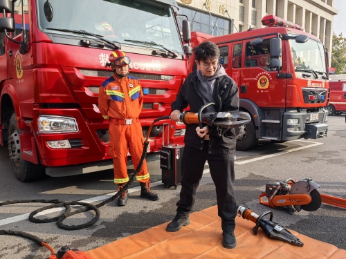 在消防员的带领和讲解下,同学们近距离参观了灭火车、抢险救援车、云梯车、供水车等多辆消防车,了解了不同消防车的车内设施和主要用途。消防员还向同学们展示了消防服的功能、穿戴顺序和携带配件,并指导同学们体验乘坐消防车和穿戴消防服。通过亲身体验,同学们了解了消防车和装备的复杂性,也对消防员在紧急情况下所承担的重任有了更深刻的认识。参观结束时,电气22-6班戴德铭动情的谈到,通过体验全副武装重达二十斤的消防服,深刻感受到了消防员这一职业的背后承载着的巨大责任与使命,进一步意识到消防员们赴汤蹈火的不易与维护人民生命安全的无私。